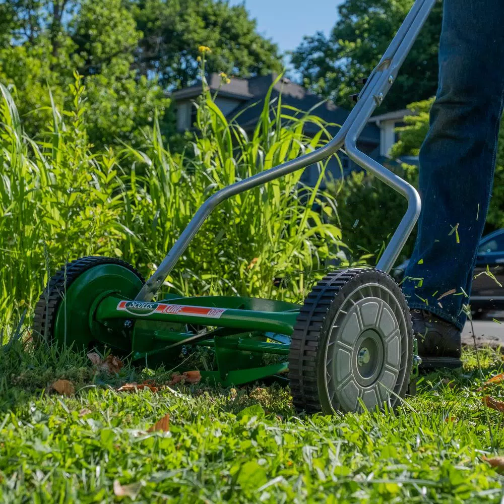 - Scotts manual push lawn mower has a cutting width of 14 in.