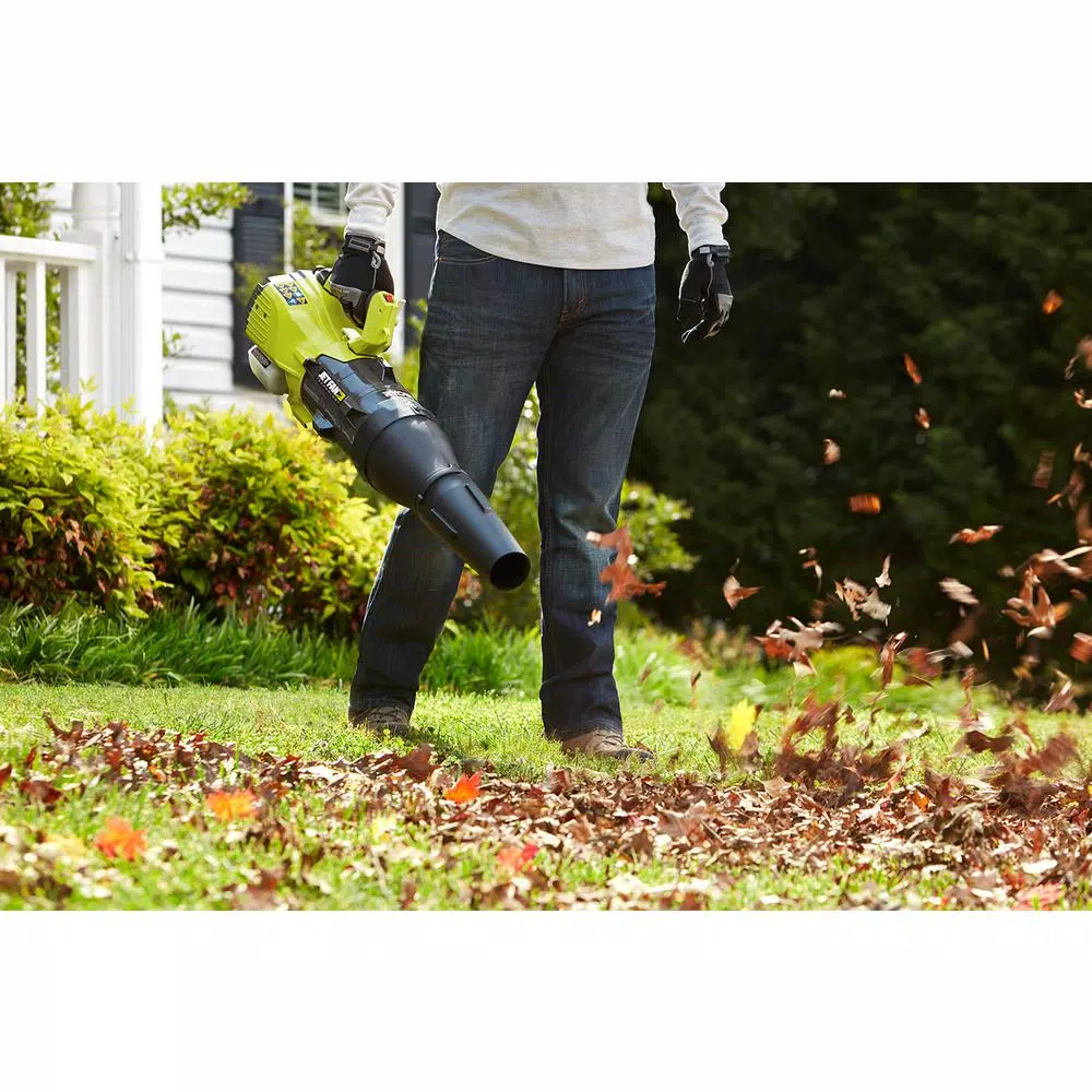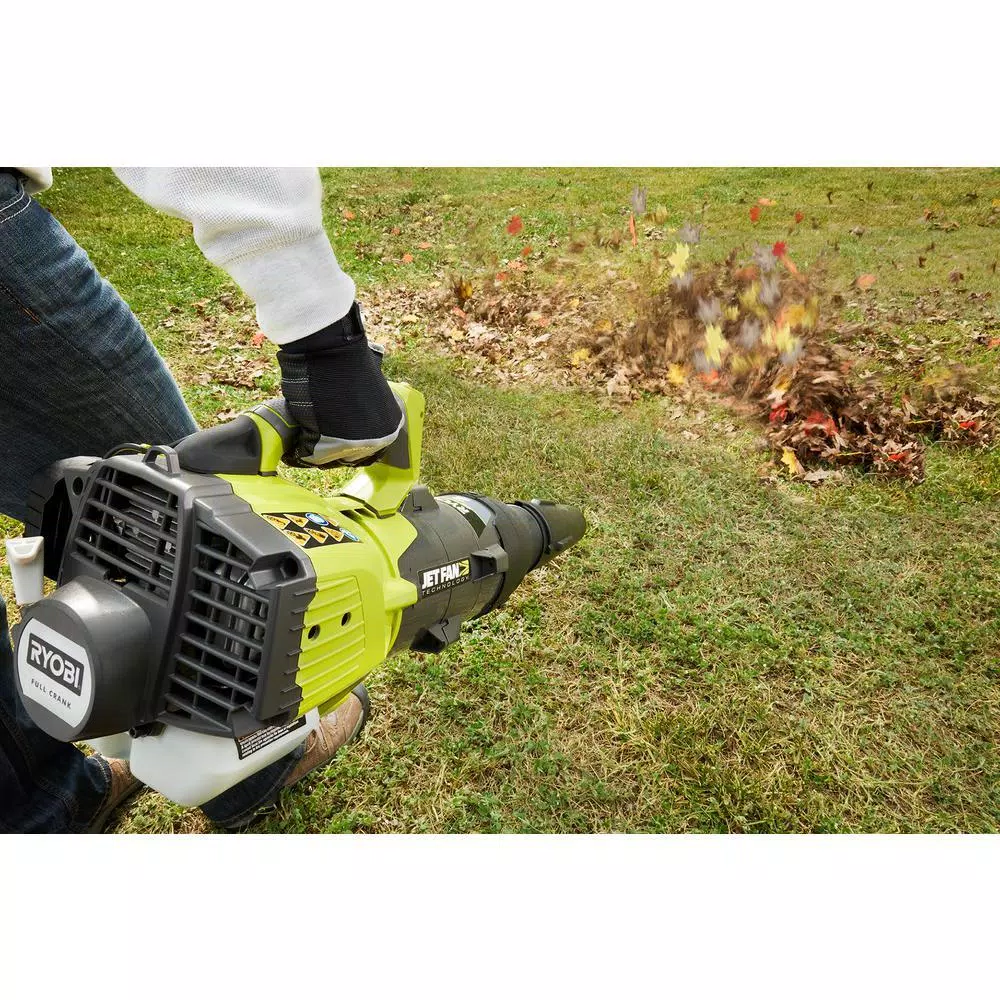 Finish the yardwork fast with the RYOBI 2 Cycle Jet Fan Blower. Producing 520 CFM at 160 MPH, this blower delivers backpack performance in a compact, handheld size. It features an innovative 3-stage jet fan design for maximum clearing force and a full crank engine for longer life. With its variable speed trigger with cruise control, you have the power to move large debris and the control to clear a delicate flower bed. This blower also has an anti-vibe handle with overmolded grips for optimized user comfort.