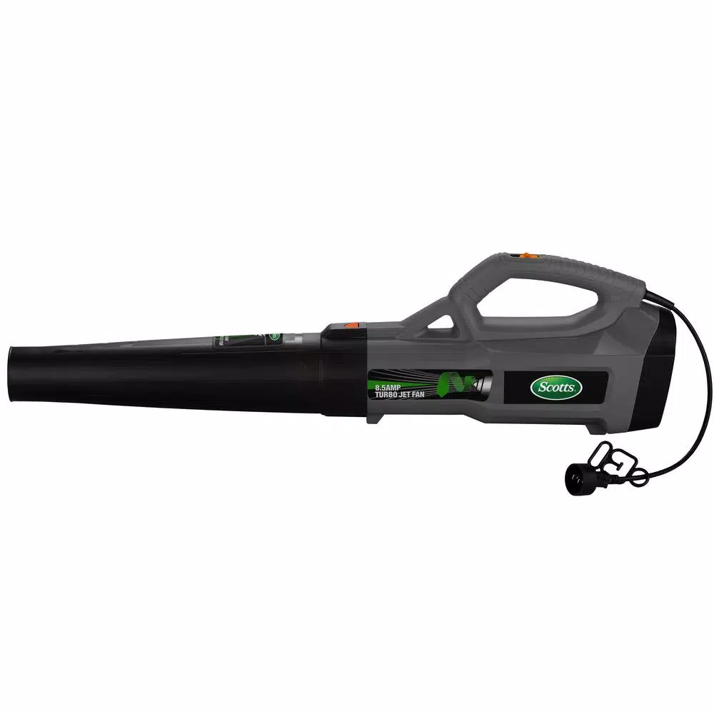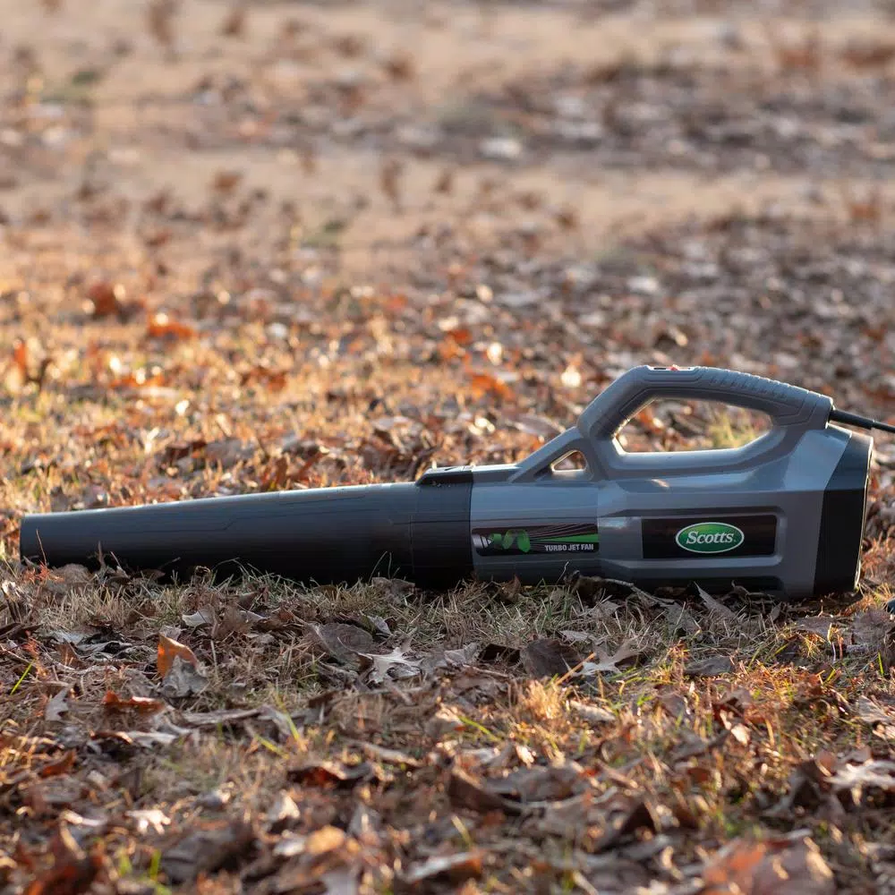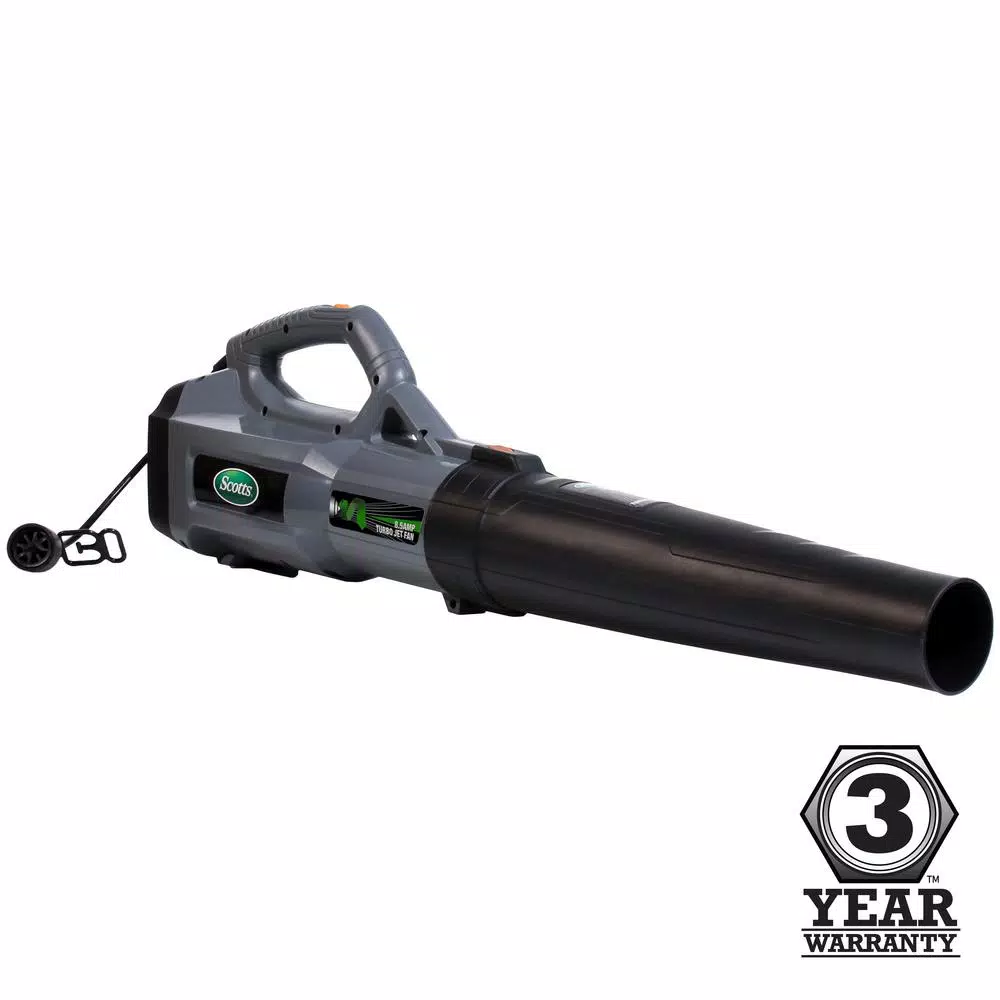 The Scotts outdoor power tool leaf blower has a powerful turbofan technology with a 2-speed control that allows maximum airspeed up to 120 MPH and airflow of 465 CFM. This Scotts corded electric blower is more powerful than a gas blower, and it does not require gas or oil to function. The electric engine starts every time that it is plugged in. This yard blower is ideal for removing yard waste on all hard surfaces. The Scotts leaves blower is durable and reliable with a 3-year manufacturer warranty.
