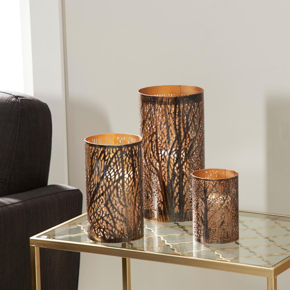 This set of three modern candle holders features cylindrical iron bodies with tree-branches patterned cutout holes. The distressed black finish adds a dramatic touch. These candle holders will add a contemporary charm to your interior decorations.