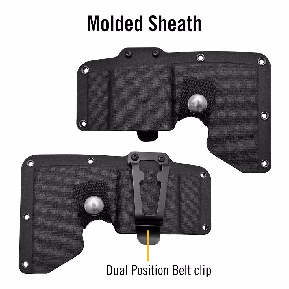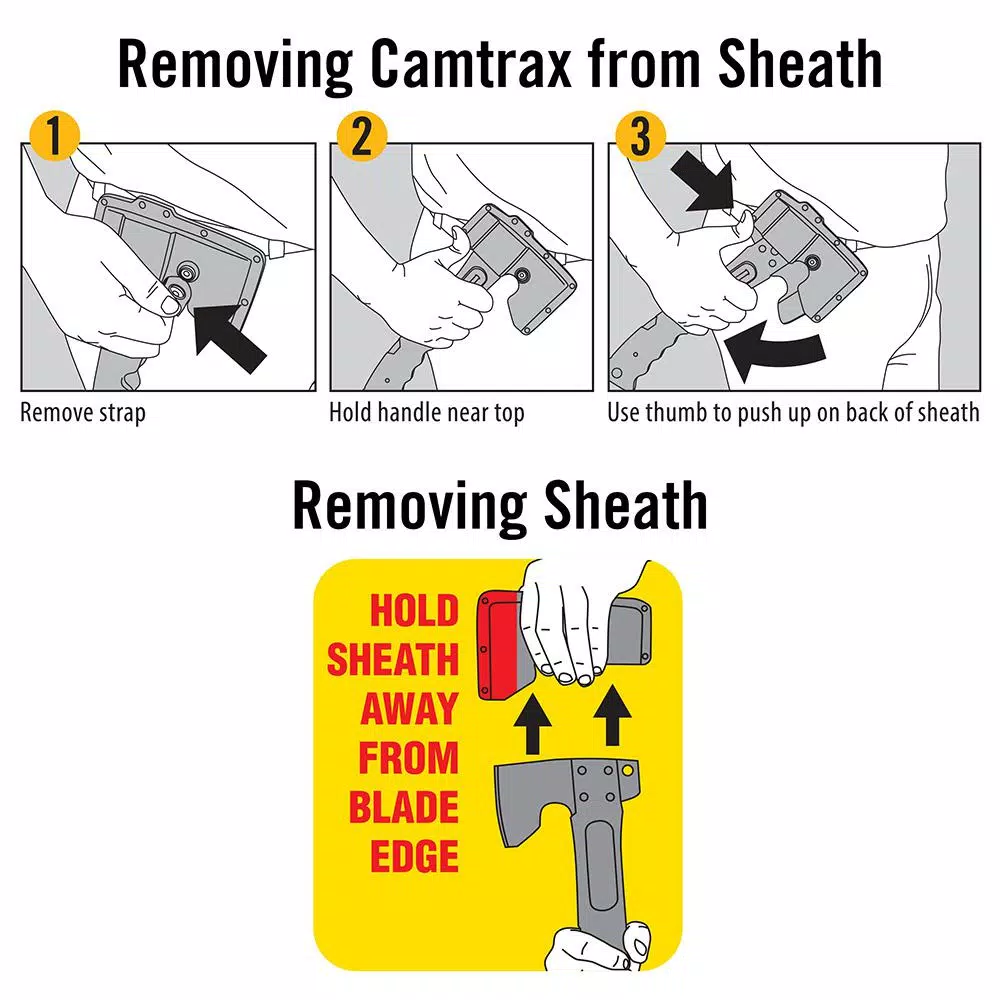 Camillus CAMTRAX 3-in-1 Hatchet: Hatchet, Lock Back Saw and Hammer with Molded Sheath. One of the best product combinations ever created. 12 in. overall length with a 2.75 in. titanium stainless steel hatchet blade, and a 7 in. lock back folding saw. Its glass filled nylon handle and a glass filled nylon sheath that has a reversible belt clip. We add glass-filled materials to polypropylene, ABS and other substrates in order to provide the strongest, most rigid handles. This features an integrated bottle cap opener. Lifetime Warranty.