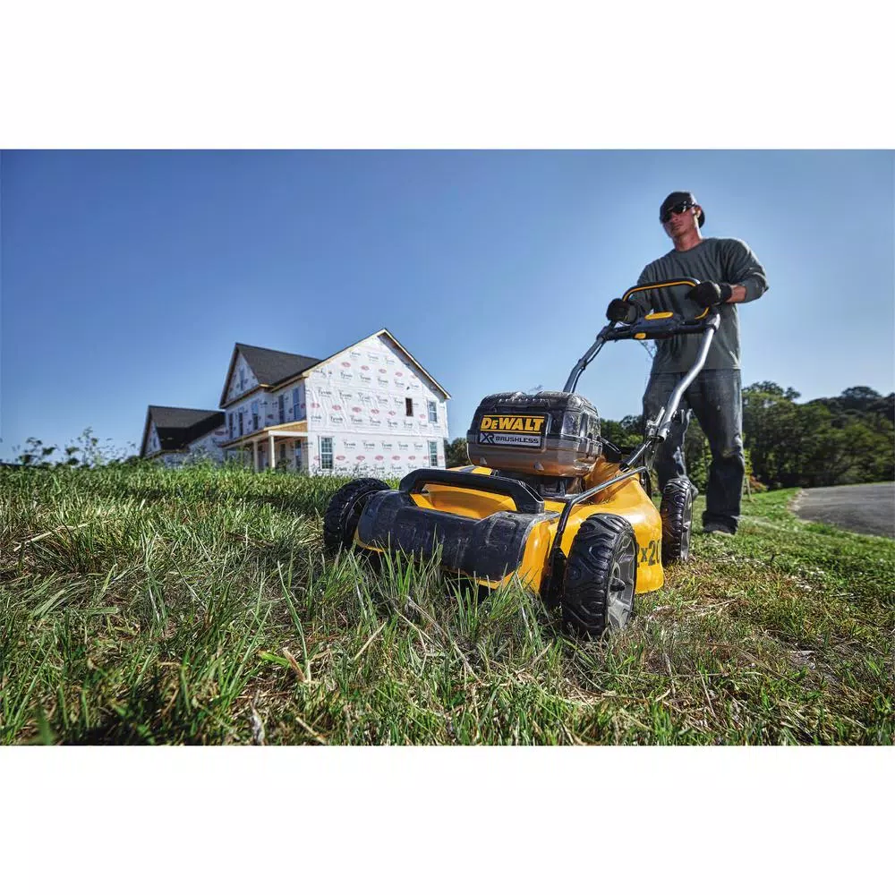 The 2x 20-Volt MAX DEWALT 3-in-1 Cordless Lawn Mower is powered by (2) 20-Volt MAX batteries to deliver 2x the voltage. The high-output brushless motor delivers powerful performance and increases torque in high overgrowth. The lawn mower’s 3-in-1 capability allows for mulching, bagging, or rear clipping discharge. It is perfect for properties up to 1/4 acre. For optimal performance, the battery-powered lawn mower can be paired with high capacity 20-Volt MAX DEWALT batteries or FLEXVOLT (R) batteries for extended runtime and maximum compatibility across DEWALT battery systems. This cordless lawn mower is designed to help you get the job done with a 20 in. metal deck, quick and easy single lever height adjustment, and folding handles for compact upright storage.