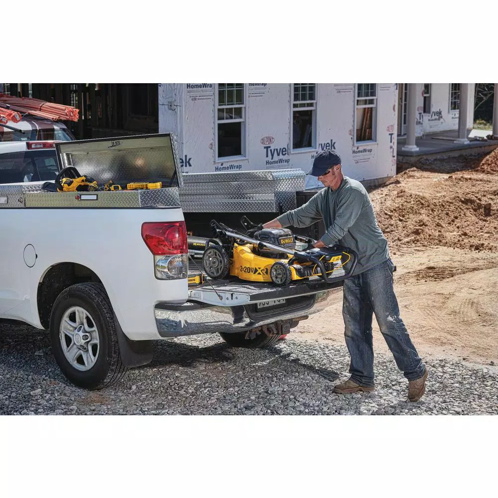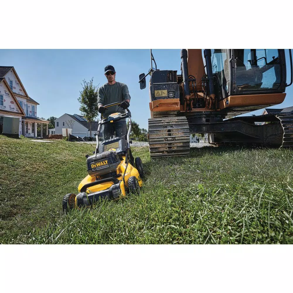 2X 20-Volt MAX DEWALT 3-in-1 Cordless Lawn Mower is powered by 2 DCB609 9.0 Ah FLEXVOLT batteries to deliver 2X the voltage. The high-output brushless motor delivers powerful performance and increases torque in high overgrowth. The lawn mower’s 3-in-1 capability allows for mulching, bagging or rear clipping discharge. It is perfect for properties up to 1/4 acre. For optimal performance, the battery-powered lawn mower can be paired with high capacity 20-Volt MAX DEWALT batteries or FLEXVOLT batteries for extended runtime and maximum compatibility across DEWALT battery systems. This cordless lawn mower is designed to help you get the job done with a 20 in. metal deck, quick and easy single lever height adjustment and folding handles for compact upright storage.
