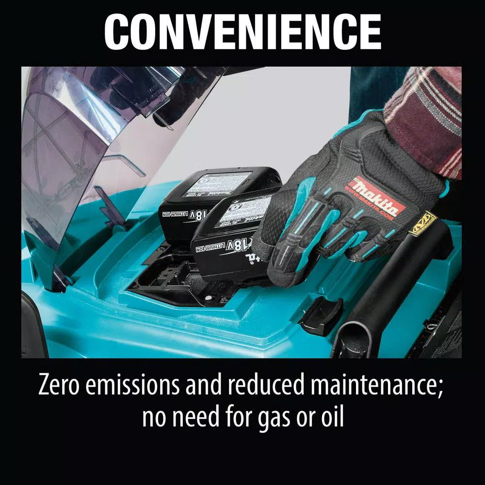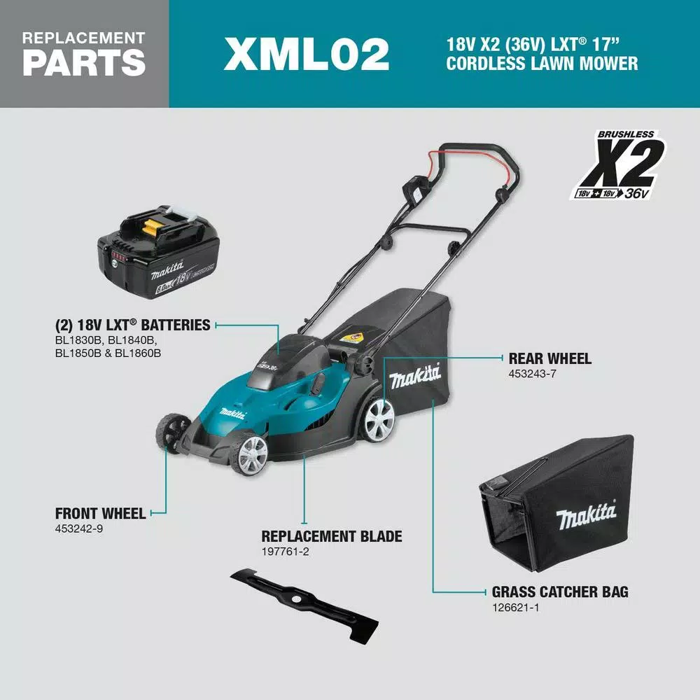 There is increasing demand for more alternatives to gas-powered outdoor power equipment. Makita is meeting demand with an expanding line of cordless OPE that includes the 18-Volt X2 LXT Lithium-Ion (36-Volt) 17 Lawn Mower. With zero emissions, lower noise and none of the maintenance associated with gas power equipment, the 18-Volt X2 (36-Volt) Cordless Lawn Mower is a welcome solution for efficient grass cutting. Its powered by two 18-Volt LXT batteries for maximum power and run time, but without leaving the 18-Volt battery platform. The Makita-built motor delivers 3,600 RPM and the Mower offers ease-of-use features including quick height adjustments, a 13 Gal. capacity grass collector and a full 17 cutting width. Using two 18-Volt LXT 5.0 Ah batteries, the Lawn Mower delivers up to 30-minutes of run time. Model XML02PTX1 is a kit and includes the Lawn Mower, 2 fast-charging 18-Volt LXT Lithium-Ion 5.0 Ah batteries and an efficient 18-Volt Dual Port Rapid Optimum Charger. The Lawn Mower features Makita Extreme Protection Technology (XPT). XPT is a protective seal inside the tool and is engineered for improved operation in harsh conditions by channeling water and dust from key internal components.