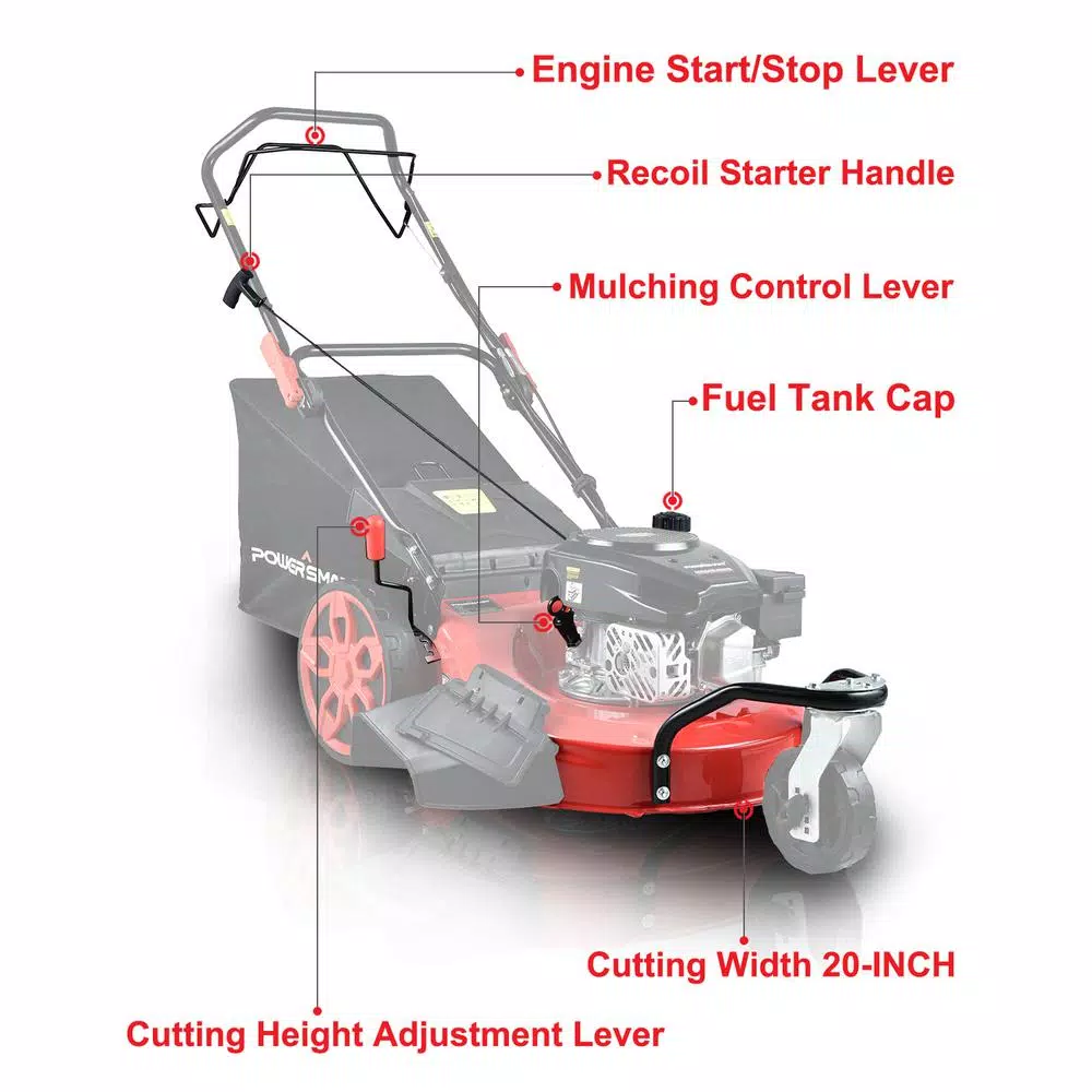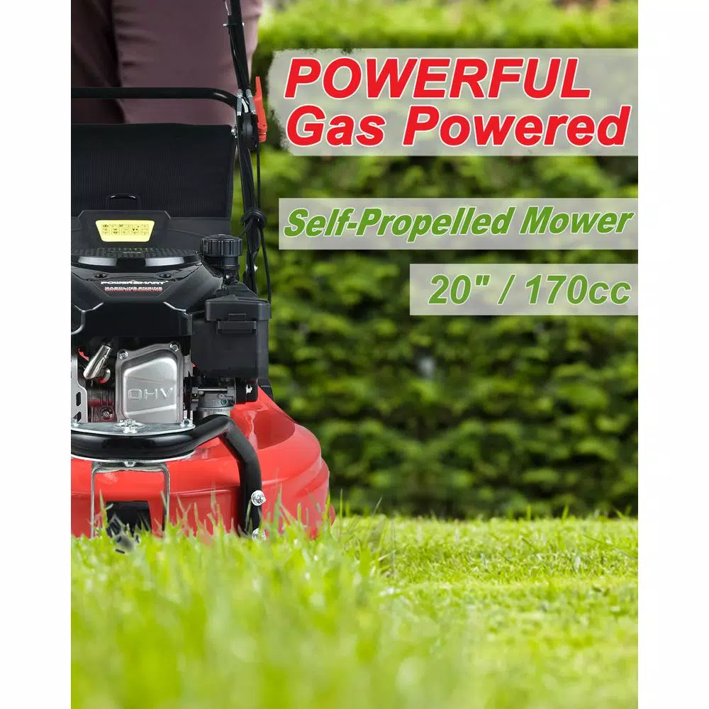 Ideal for the smaller yard, the compact, 170 cc self-propelled gas-powered Power Smart PSM2020 lawn mower is easy to operate in tight spaces and features 3 cutting systems including side discharge option, mulching capability, plus a rear bag. Offering a smart, powerful, highly efficient and lightweight design, the PSM2020 features a rear wheel drive mode that makes it easier to maneuver on uneven and rough terrain. The deep dome deck design accompanied with the sharp and solid blade makes for better mulching. The mower also features a durable steel deck that cuts a 20 in. swath and adjustable height from 1.2 in. to 3.15 in. to meet your varying needs.