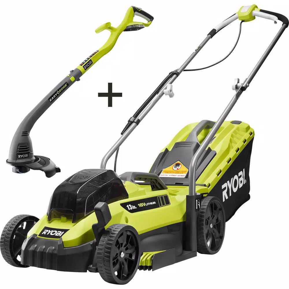 This RYOBI ONE+ mower, powered by an 18-Volt 4.0 Ah Lithium-ion battery, is compatible with over 175 other ONE+ tools. With a push-button start and 5-position single point height adjustment, you’re ready to begin in seconds without having to worry about gas or oil. The Lightweight design and carrying handle, make this mower easy to move from 1 place to another. The durable, hard top grass bag and 2-in-1 mulching or bagging system allow you to get the job done quickly. The easy fold down handles make it simple to store when the job is done. Also included in this combo, the perfect addition to your ONE+ Tool collection. This ONE+ String trimmer is lightweight, easy to use and easy to store. This trimmer accepts all RYOBI 18-Volt batteries, so it will work with your lithium-ion or ni-cad batteries. With an automatic-feed string head, trimmer provides a manageable 10 in. cut width. The shaft also rotates to edger mode so you can make quick work of your small lawn care projects. ONE+ batteries and Chargers sold separately. Backed by a 3-year warranty.
