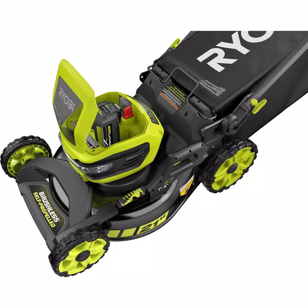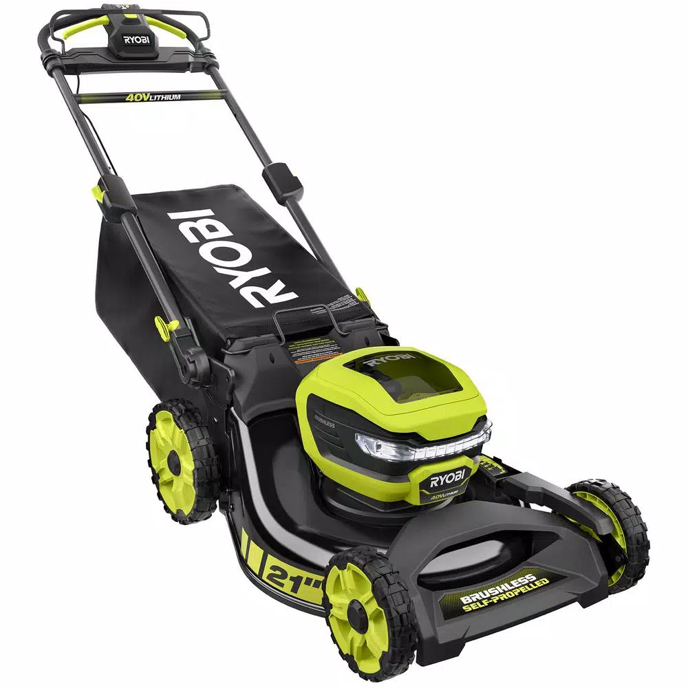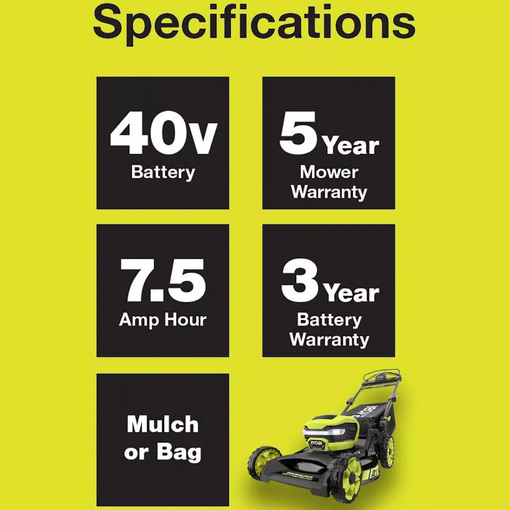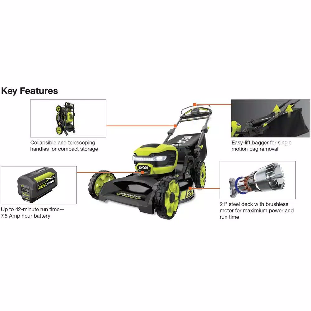 RYOBI redefines power and convenience with the new 40-Volt 21 inch Self-Propelled Cordless Lawn Mower. Combining 40-Volt of lithium power with advanced brushless technology this mower delivers GAS-LIKE POWER, surrendering nothing but gas. Featuring Rear Wheel Drive this mower increases your traction making it easier to maneuver and almost effortless to use. The high capacity 7.5 Ah battery delivers maximum run-time and instant power at the push of a button. The 21 Steel Deck was built for durability featuring a 7-position single point height adjustment so you can select your ideal grass height. With the 3-in-1 mowing functions you can choose between bagging or mulching your grass or using the side discharge accessory sold separately online. When the job is done simply lift the single motion lock-and-release bagger to empty your grass and place it back down with ease. The collapsible telescoping handles fold down easily when the job is done making it ideal for compact spaces. This mower and the included battery are compatible with all RYOBI 40-Volt tools, batteries and chargers. Backed by a 5-Year Limited Warranty.
