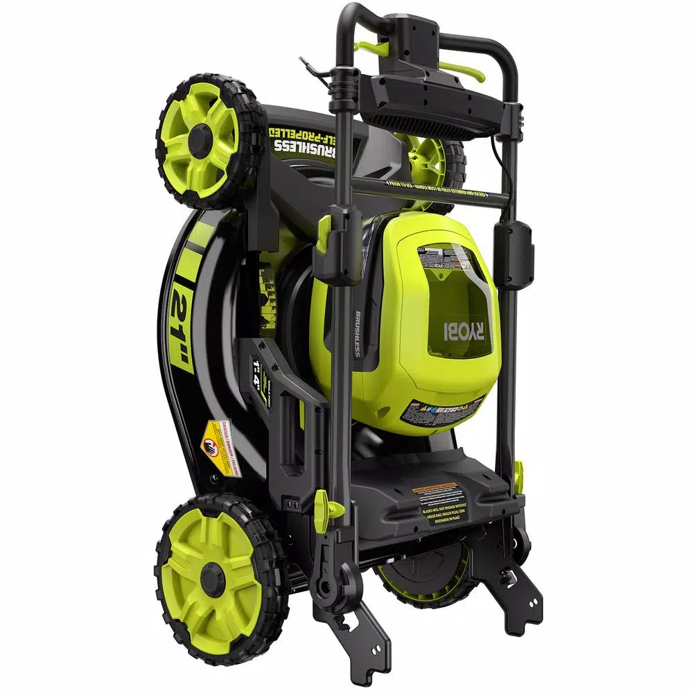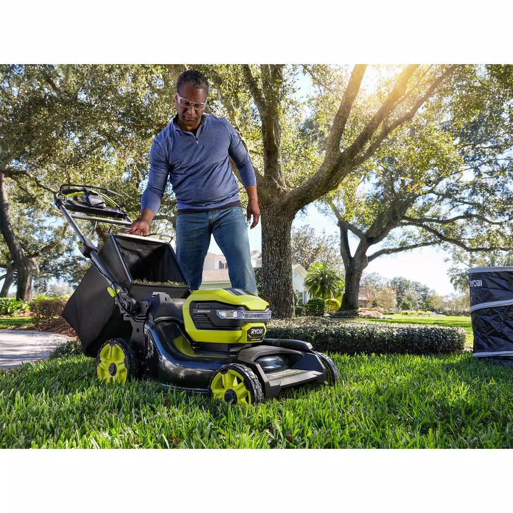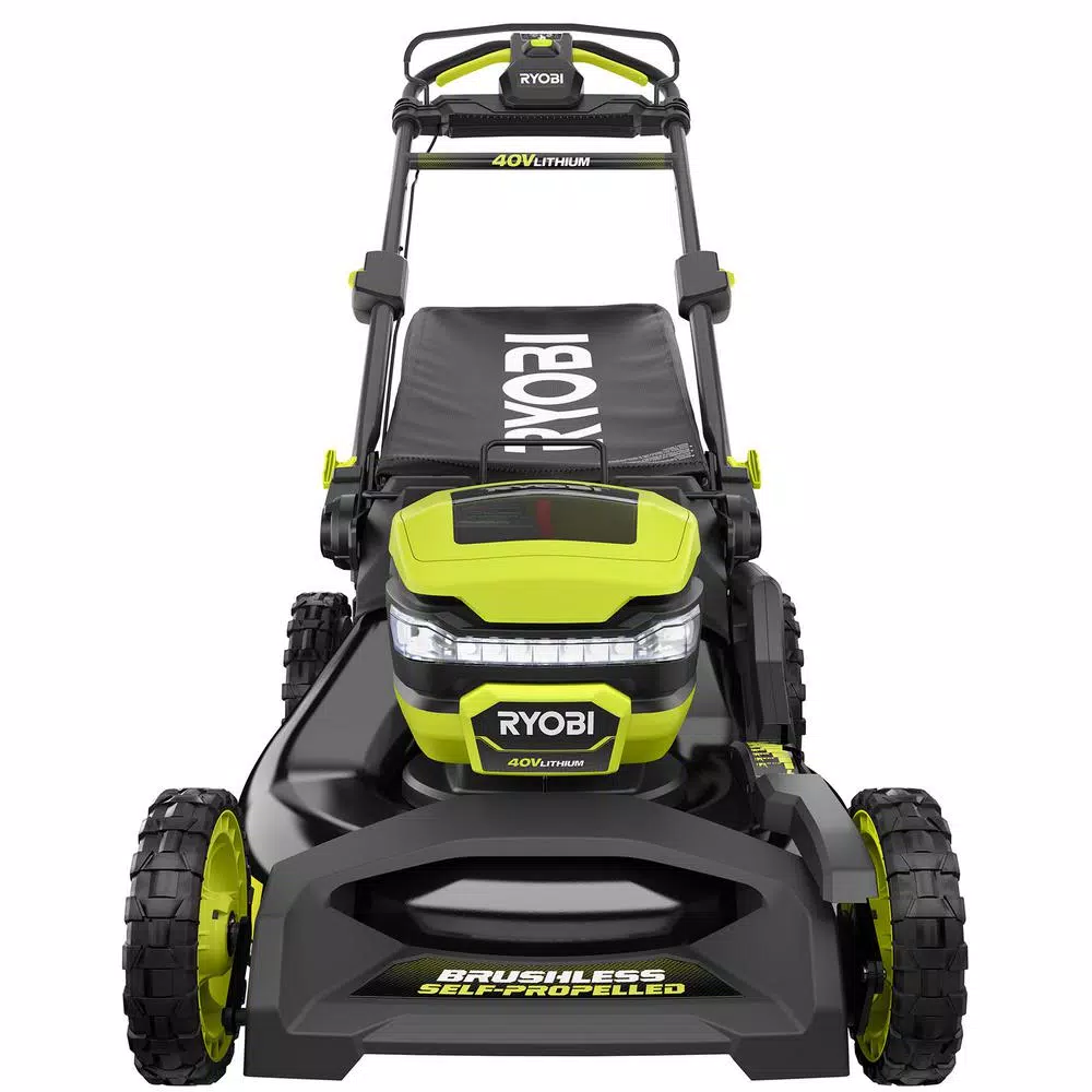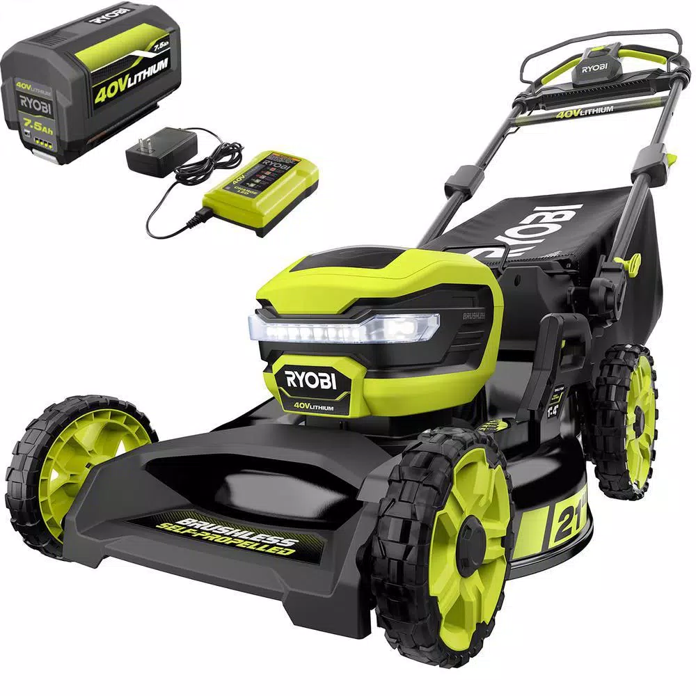 RYOBI redefines power and convenience with the new 40-Volt 21 inch Self-Propelled Cordless Lawn Mower. Combining 40-Volt of lithium power with advanced brushless technology this mower delivers GAS-LIKE POWER, surrendering nothing but gas. Featuring Rear Wheel Drive this mower increases your traction making it easier to maneuver and almost effortless to use. The high capacity 7.5 Ah battery delivers maximum run-time and instant power at the push of a button. The 21 Steel Deck was built for durability featuring a 7-position single point height adjustment so you can select your ideal grass height. With the 3-in-1 mowing functions you can choose between bagging or mulching your grass or using the side discharge accessory sold separately online. When the job is done simply lift the single motion lock-and-release bagger to empty your grass and place it back down with ease. The collapsible telescoping handles fold down easily when the job is done making it ideal for compact spaces. This mower and the included battery are compatible with all RYOBI 40-Volt tools, batteries and chargers. Backed by a 5-Year Limited Warranty.