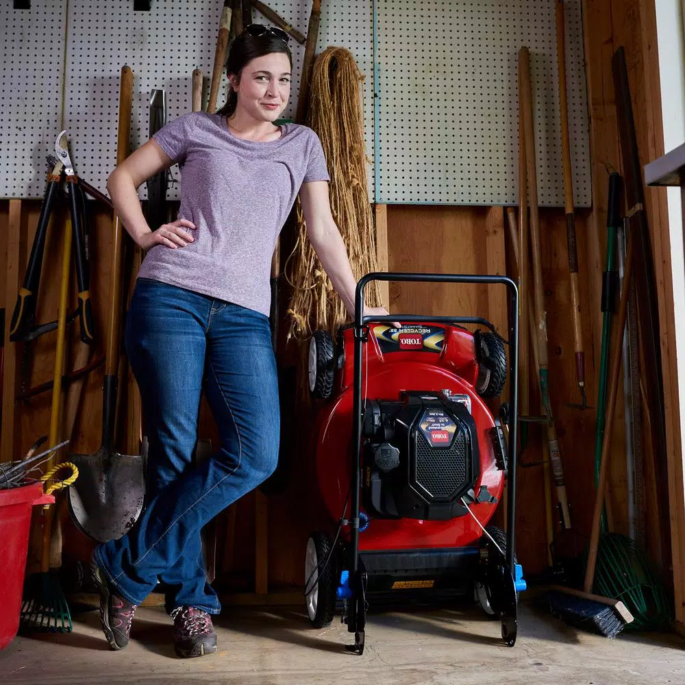 - Save storage space; the battle to free up space in your garage is always fierce, and odds are your lawn mower ends up wherever you can jam it, whether it fits or not; now you can fold, lock and store your Toro practically anywhere in your garage or shed with SmartStow; it’s proven to reduce the storage footprint by up to 70%, and provides easy access to clean under the deck and service the blade