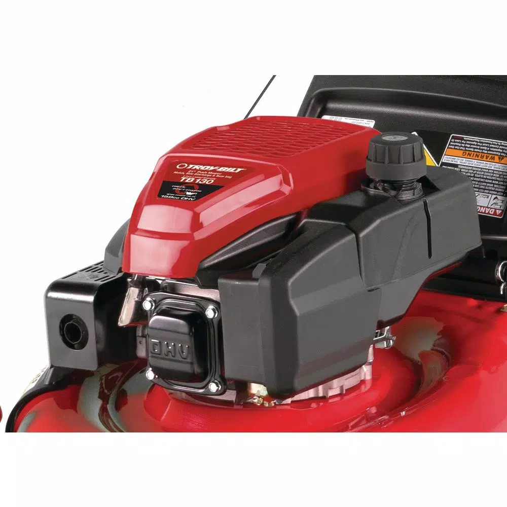 Eliminate oil changes on the Troy-Bilt TB130 mower with the innovative Check, Don’t Change system on the Troy-Bilt engine. Simply check the oil each time and top off as needed, reducing maintenance time and having to dispose of old oil. With rear bag, mulch kit and side discharge options included, you have a choice for disposing of grass clippings. The 11 in. high rear wheels provide improved traction and maneuverability on hills and over rough spots in the lawn. Dual-lever height adjusters are conveniently located to quickly adjust the cutting height and the TriAction cutting system uses a rake guard, symmetrical deck and specialized blade to deliver a clean, even cut every time. You can depend on Troy-Bilt to keep yardwork from feeling like a chore, and we won’t let you down.