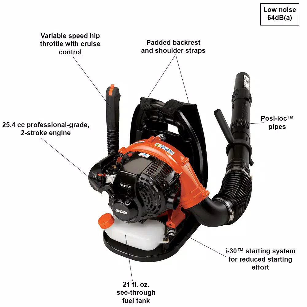 Strong performance and low noise makes the ECHO PB-265LN gas leaf blower a great choice. The yard blower’s 25.4 cc professional grade engine produces 375 CFM and 158 MPH at the nozzle at only 64 dB (A). This lawn blower is designed to provide long-lasting durability and is also backed by a 5-year consumer warranty/2-year professional warranty.