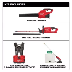 - Includes: M18 FUEL blower 2724-20, M18 FUEL hedge trimmer 2726-20, Switch Tank backpack pesticide sprayer 2820-20PS