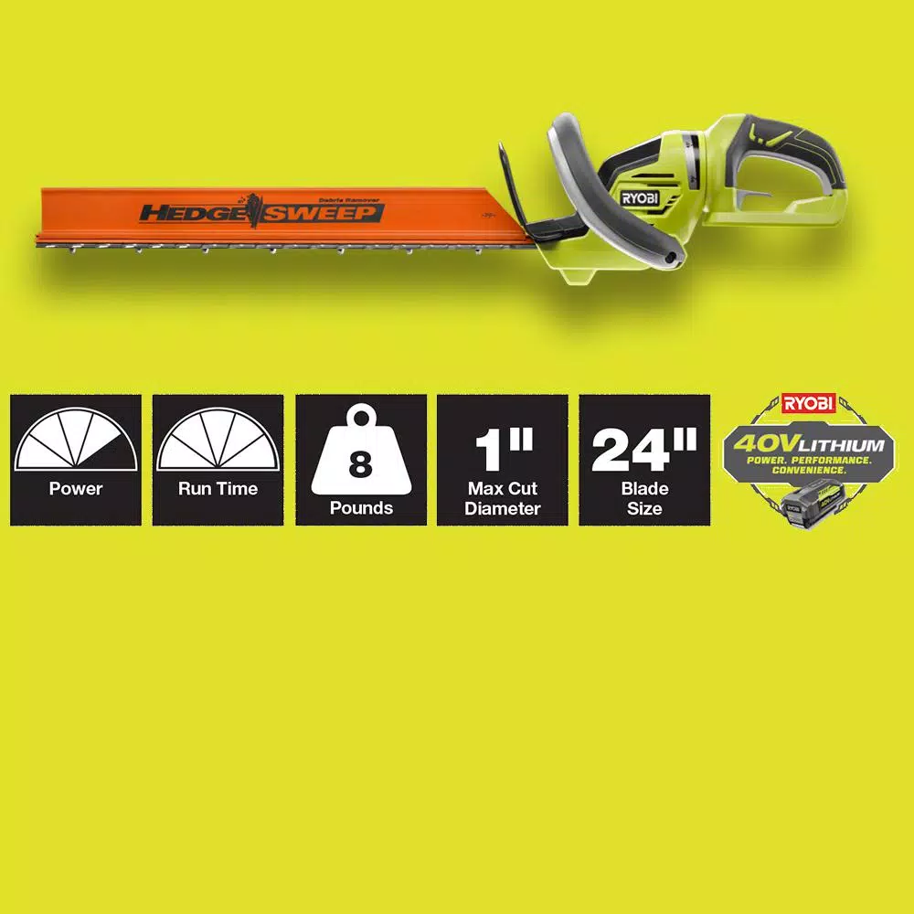 The RYOBI 40-Volt Lithium-Ion Jet Fan Blower takes cordless tools to the next level. This blower has a jet fan design for increased air flow, delivering an impressive 525 CFM and 110 MPH of clearing power. It also features a variable speed trigger for customized control and a soft-grip handle for user comfort. The turbo button gives you an extra boost, to clear through heavier leaves and debris. Also included, the RYOBI 24 in. Cordless Hedge Trimmer delivers Gas-Like power and longer run time than a gas hedge trimmer with a cutting speed of 3200 strokes per minute. The dual action steel blades offer an aggressive 1 in. cutting capacity, all while reducing unsafe vibration. Other features include a rotating rear handle for precision cutting at any angle, along with a wrap-around front handle for ultimate control. Featuring the innovative Hedge Sweep design, this trimmer easily clears debris and clippings while you trim. Both blower and trimmer are covered under a 5-Year Limited Warranty. The battery is covered under a 3-Year Limited Warranty.