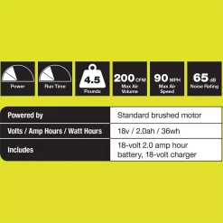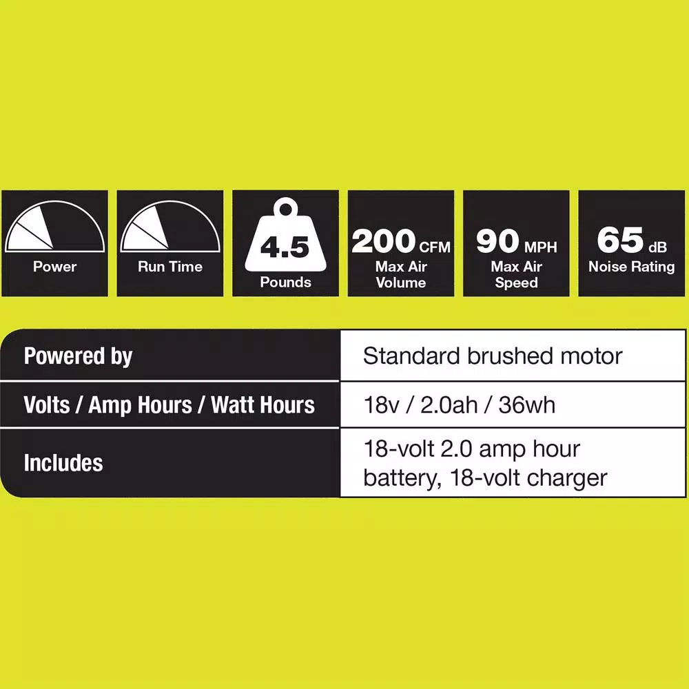This RYOBI 18-Volt ONE+ Cordless Blower is perfect for hard surfaces, blasting away leaves and debris at 200 CFM and 90 MPH. The compact, lightweight design makes it easy to handle and reduces fatigue. With cordless convenience you gain increased mobility without the hassle of gas and oil. Best of all, the included 18-Volt battery is compatible with over 175 tools in the RYOBI ONE+ family.
