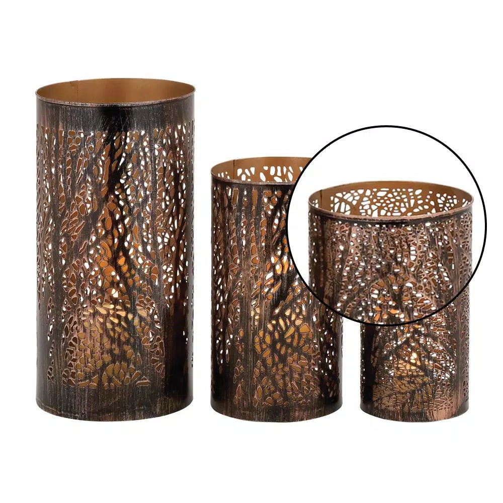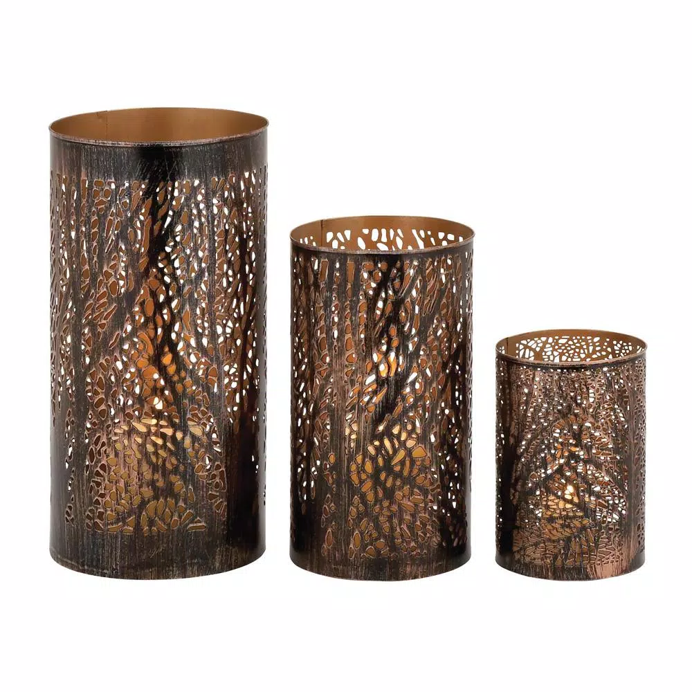 This set of three modern candle holders features cylindrical iron bodies with tree-branches patterned cutout holes. The distressed black finish adds a dramatic touch. These candle holders will add a contemporary charm to your interior decorations.