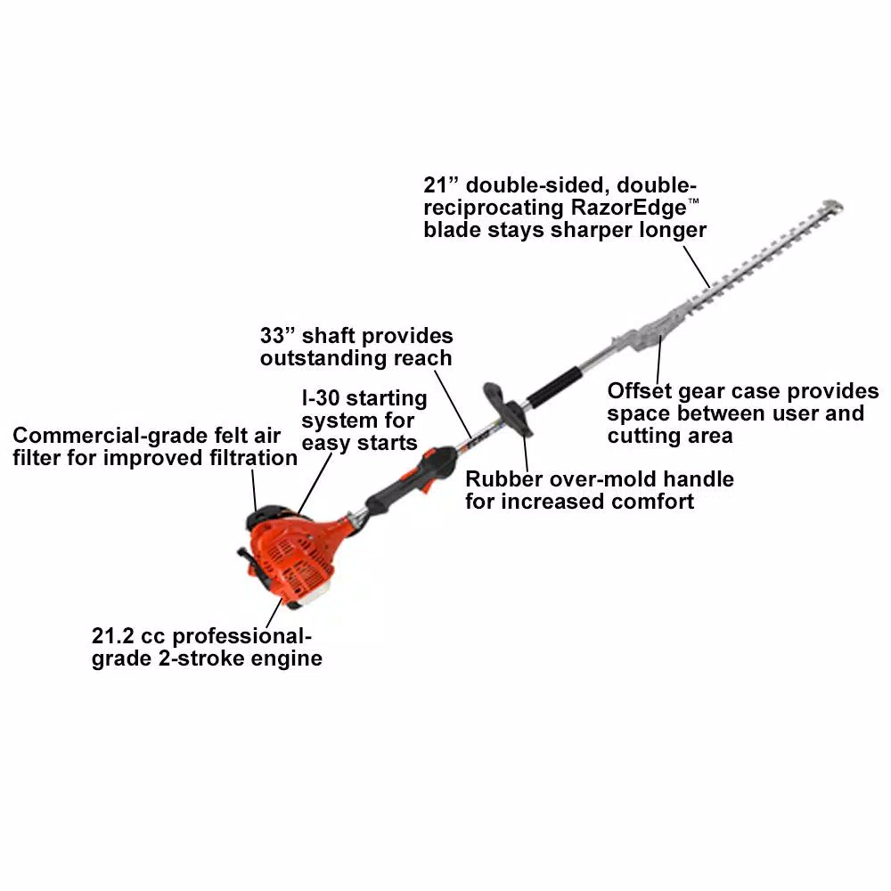 The ECHO hedge trimmer SHC-225 is a 21 in. hedge trimmer with a 33 in. shaft that limits stooping to cut low growth. The RazorEdge blades featured on this gas hedge trimmer are double-sided, double reciprocating for enhanced cutting performance in addition to staying sharper for longer periods of time. The gas powered hedge trimmer also has a vibration reduction system for increase comfort along with over-molded left and right-handed grips. The bush hedger comes standard with ECHO’s revolutionary starting technology that reduces pulling effort to start unit by 30%.
