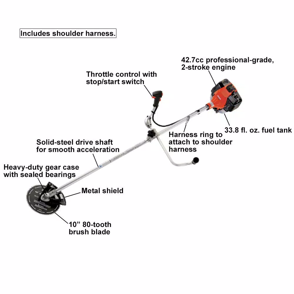 - Brush cutter features a 42.7 cc professional-grade 2-stroke engine