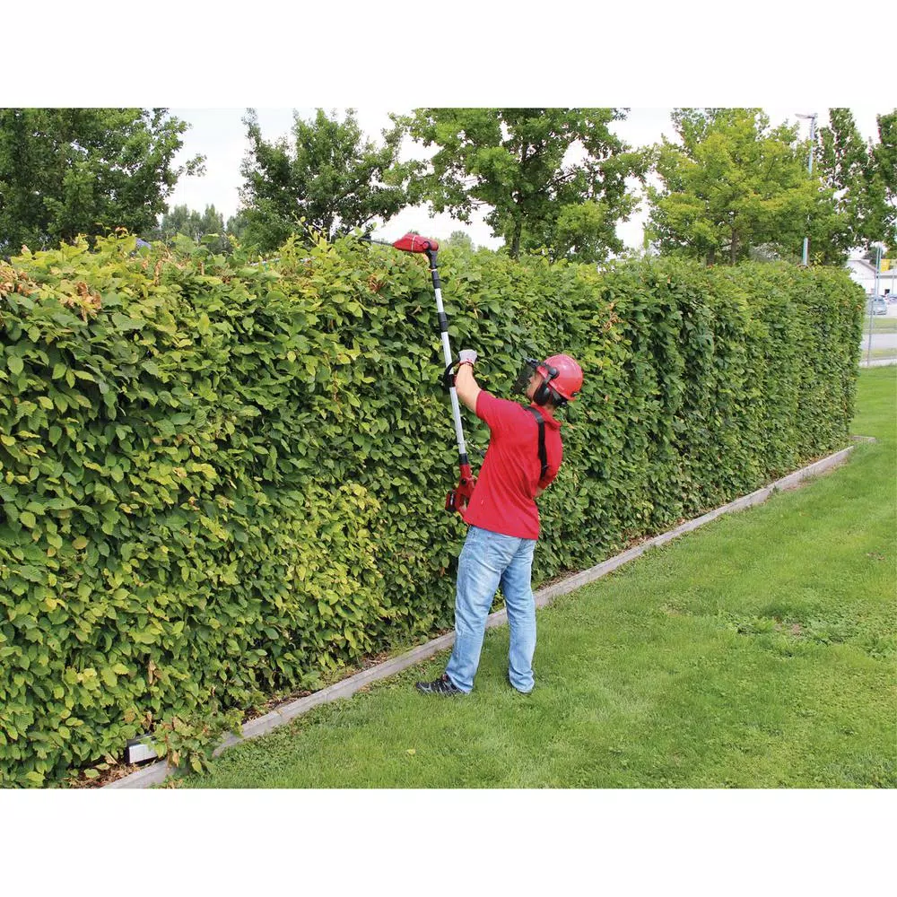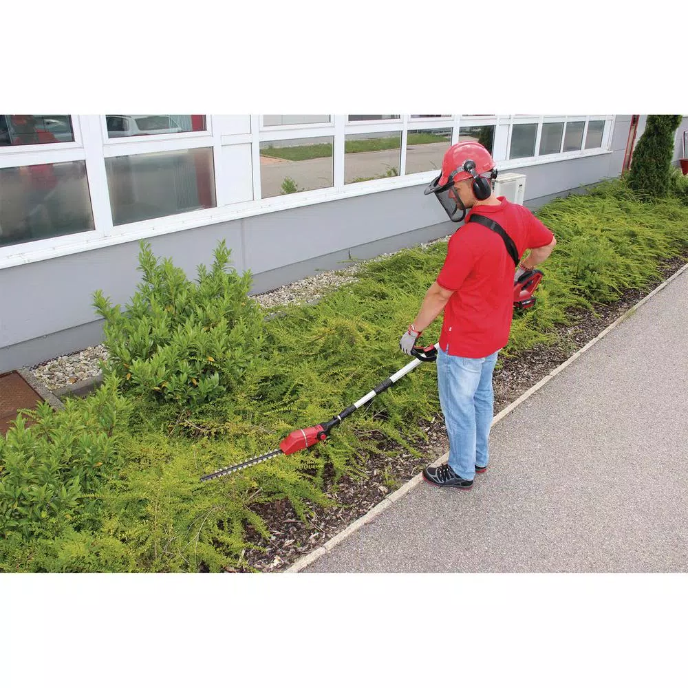 The cordless multi-functional tool GE-HC 18 Li T is a powerful device to cut branches upside and high hedges easily from the ground. Thereby, the metal gearbox provides a long service life, and the OREGON quality blade and OREGON chain ensure clean cutting results. The top part is rotatable for 90° and allows effortless horizontal cuts. The claw stop prevents slipping during the sawing works. The automatic chain lubrication supplies the Oregon chain with the needed lubrication by means of an oil container. If necessary, it can be tightened and changed with its practical chain tension without any tools. A chain catch bolt prevents the unwanted slipping of the chain from the blade reliably. The hedge trimmer knives made of laser-cut and diamond-ground steel ensure clean cutting results. The hedge trimmer can be transported safely and comfortably in the stable bag. The infinitely adjustable telescopic handle can exactly be set from 880 to 1840 mm to the required working height. The also infinitely adjustable, additional handgrip can be adapted to any user due to its practical quick lock. To execute even difficult cuts aloft cleanly and precisely, the motor head can be sloped 7-fold and the main grip 4-fold. Therefore, they can be adjusted to every working situation. Battery and charger are not included in delivery.