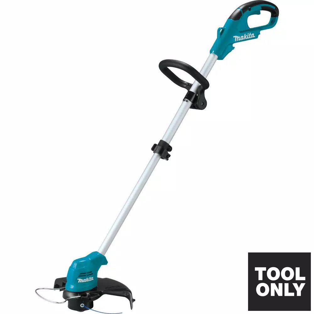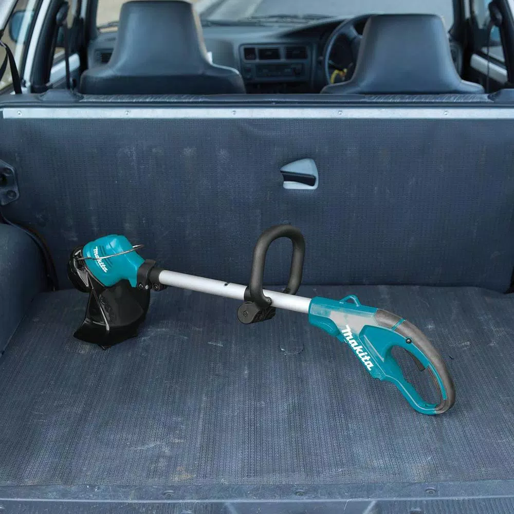 The Makita 12-Volt CXT Lithium-Ion Cordless String Trimmer (model RU03Z, tool only, batteries and charger sold separately) is a versatile and powerful solution with less weight for landscape cutting and trimming, but without gasoline. The RU03Z delivers 9,000 RPM and up to 38-minutes of run time on a single charge of the 12-Volt CXT Lithium-Ion 4.0 Ah battery (sold separately). It has several advantages over gas-powered trimmers: the RU03Z has zero emissions and reduced maintenance, with no need for gas or oil. For users, the tool is always ready to use: simply load a fully-charged 12-Volt CXT Lithium-Ion battery and get to work. Versatility features include a telescoping shaft to adjust the length of the tool, a 180° rotating head with 5 adjustable positions, an adjustable loop handle, and more. It weighs only 4.2 lbs. with battery (sold separately).