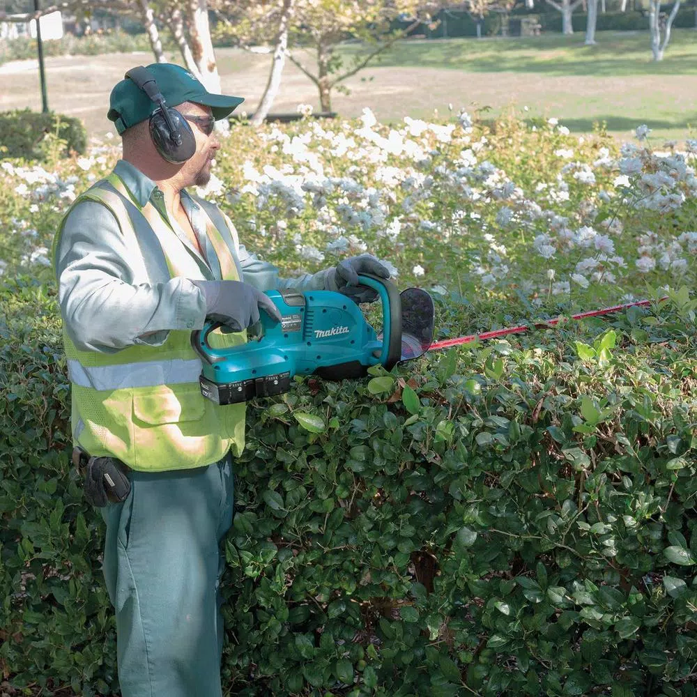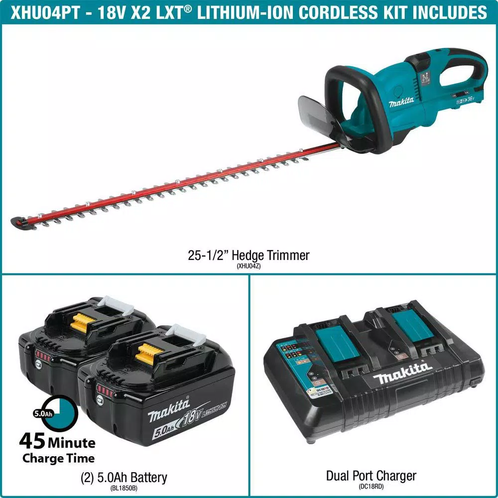 The Makita 18-Volt X2 LXT Hedge Trimmer (model XHU04PT) is powered by two 18-Volt LXT batteries (36-Volt), so you get 36-Volt power and run time for corded and gas-powered demands, without leaving the 18-Volt LXT platform. Model XHU04PT is a kit and includes 2 fast-charging 18-Volt LXT 5.0 Ah batteries and an 18-Volt Dual Port Charger that will charge 2 batteries simultaneously for increased productivity and less downtime. The XHU04PT Hedge Trimmer has a 25-1/2 in. blade and the Makita-built motor delivers 1,800 SPM for increased cutting speed, but with less noise (only 86.5 dBA. It has zero emissions and reduced maintenance: there’s no engine oil to change, no spark plug to replace and no air filter or muffler to clean. And there’s no need to drain the fuel for storage. Simply pickup your XHU04Z, load two 18-Volt LXT Lithium-Ion batteries and the trimmer is ready to use. Additional features include a 2-handed operation switch is engineered to activate the motor only when the switch and top handle are engaged, an electric brake for maximum productivity and more. It’s part of Makita’s expanding 18-Volt Lithium-Ion system, the world’s largest cordless tool system powered by 18-Volt Lithium-Ion slide-style batteries. Makita 18-Volt Lithium-Ion batteries have the fastest charge times in their categories, so they spend more time working and less time sitting on the charger.