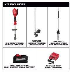 - Includes: M18 FUEL power head (2825-20), string trimmer attachment (49-16-2717), M18 REDLITHIUM HO 8.0 battery (48-11-1880) and M18 and M12 rapid charger (48-59-1808), M18 FUEL QUIK-LOK 10 in. pole saw attachment (49-16-2720