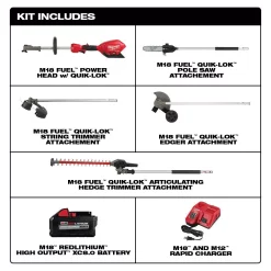 - Includes: M18 FUEL power head with QUIK-LOK (2825-20), M18 FUEL QUIK-LOK string trimmer attachment (49-16-2717), M18 REDLITHIUM HO8.0 battery (48-11-1880) and M18 and M12 rapid charger (48-59-1808), articulating hedge trimmer attachment (49-16-2719) and strap, edger attachment (49-16-2718) and scrench, 10 in. pole saw attachment (49-16-2720) and scrench