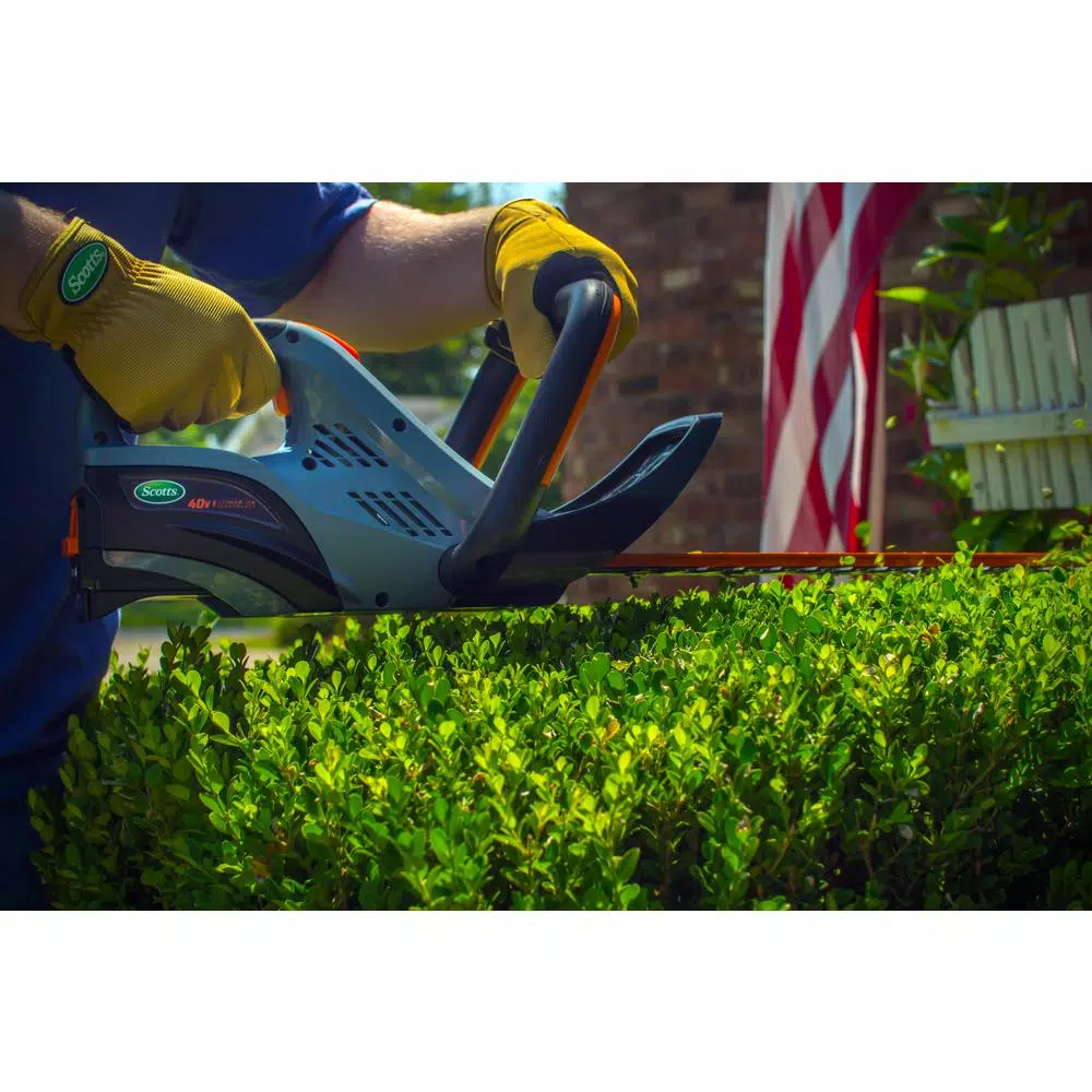 Scotts cordless hedge trimmer has a battery-operated brushless motor with 2-speed settings to choose from. Its bar delivers 3000 strokes per minute to cut hedges and bushes in your yard. The soft-grip handle is non-slip and comfortable to reduce arm and hand strain while trimming through branches. It has a wrap-around safety handle for cutting safety and precision, so you only get a clean cut in your yard. This Scotts 40V cordless trimmer includes a 40-Volt 2.0Ah battery and fast charger.