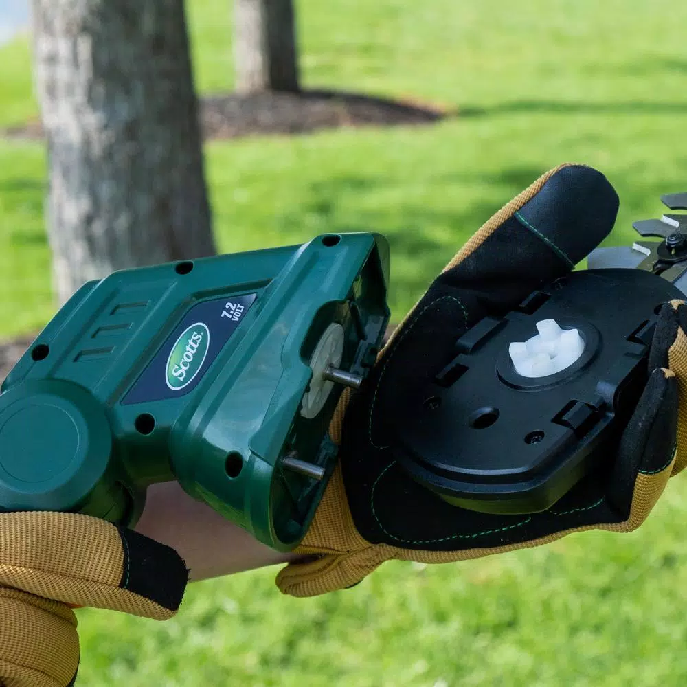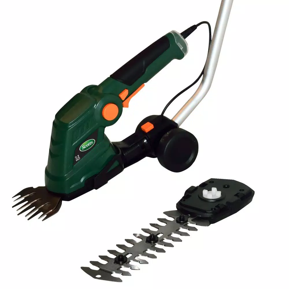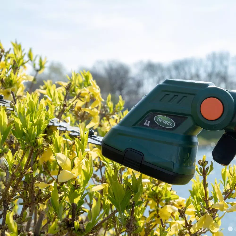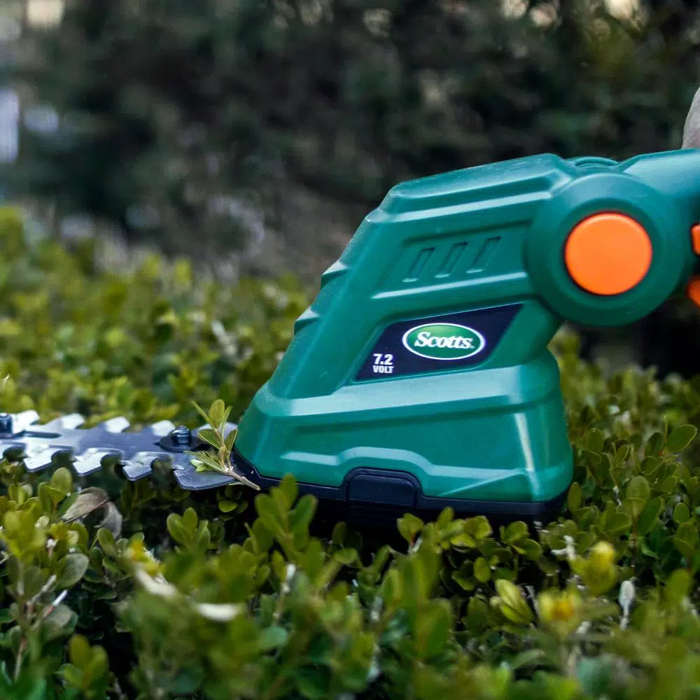 Scotts 7.2-Volt shrub shear with extension pole is designed to make your outdoor tasks easier, so you can accomplish them faster. This edger is maintenance-free because it has an planet friendly design that only requires a battery to function. It is lightweight and easy to use, so you can beautify your garden comfortably. There is an interchangeable blade system that doesn’t require special tools to be changed. This battery-operated hedge trimmer is convenient and reliable for any cutting and trimming tasks in your garden. The 6.5 in. shrubbery blade and 4 in. grass shear blade gives you optimal versatility for your gardening tasks at hand. This small electric hedge trimmer has a telescopic handle so you can easily trim grasses and weeds without bending over.