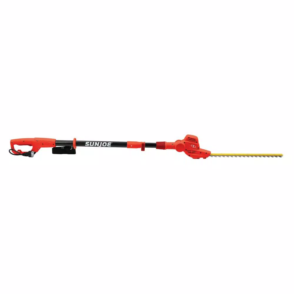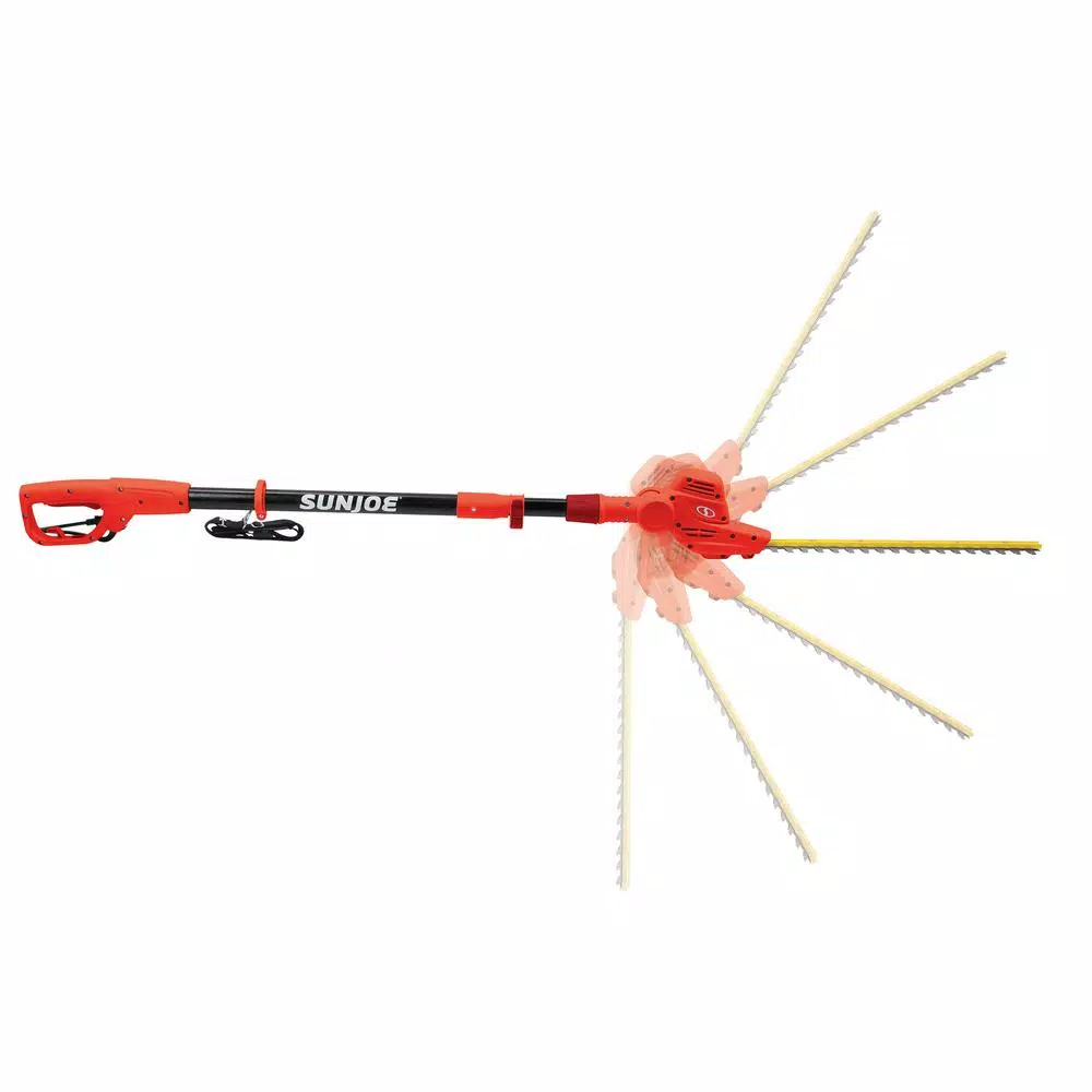 Ditch the ladder and shape up the shrubs while you stand safely on solid ground with the Sun Joe Multi-Angle Telescoping Pole Hedge Trimmer. Sun Joe’s 7.4 ft. extension pole provides up to an impressive 13 ft. of overhead reach, while the durable 18 in. rust-resistant, hardened steel blades let you reach higher and sweep farther with each pass for perfectly sheared shrubs. The powerful 3.8 Amp electric motor and multi-angle pivoting head allow for precise trimming of most tall hedges and bushes beyond your reach. This trimmer is also great in tight spaces to groom where a traditional hedge clipper simply can’t cut it, like between the house and the hedges, between ornamental plants and the fence or beneath the bushes. SJH901E features a quick-release strap and safety button to prevent accidental starts and a sheath for safe blade storage when the day is done. Cut your hedge trimming chores down to size with the handy Sun Joe Electric Telescoping Pole Hedge Trimmer.