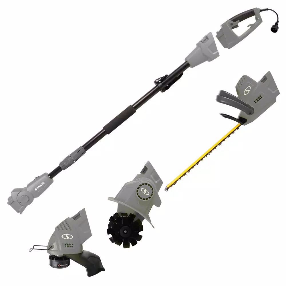 Is your lawn looking a little out of shape? Is your garden overgrown? Do your hedges need a haircut? The Sun Joe Electric Multi-Tool Lawn Care System is like having a lawn crew in a box: One pole powers three robust tools to tackle everything from trimming the grass, to cutting the hedges, and tilling the garden. The expandable garden tool system features three adjustable and interchangeable power heads and an 5.9-foot extension pole with removable handle to quickly convert from 19-inch 4.5-amp handheld trimmer to pole hedge trimmer; from 12-inch 3-amp string trimmer to 6.3-inch 3.5-amp tiller cultivator. Swap tools in seconds to do more in less time: trim hedges high and low, till the turf, or trim the grass. Includes extension pole with removable handle plus string trimmer, hedge trimmer and tiller attachments. Cut your yard chores down to size and Go With Joe – the SUN JOE Electric Multi-Tool Lawn Care System. Get Equipped.