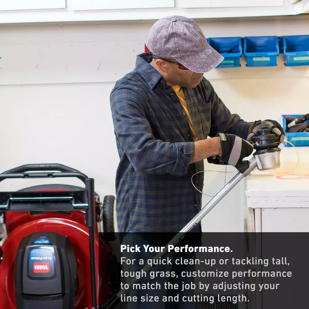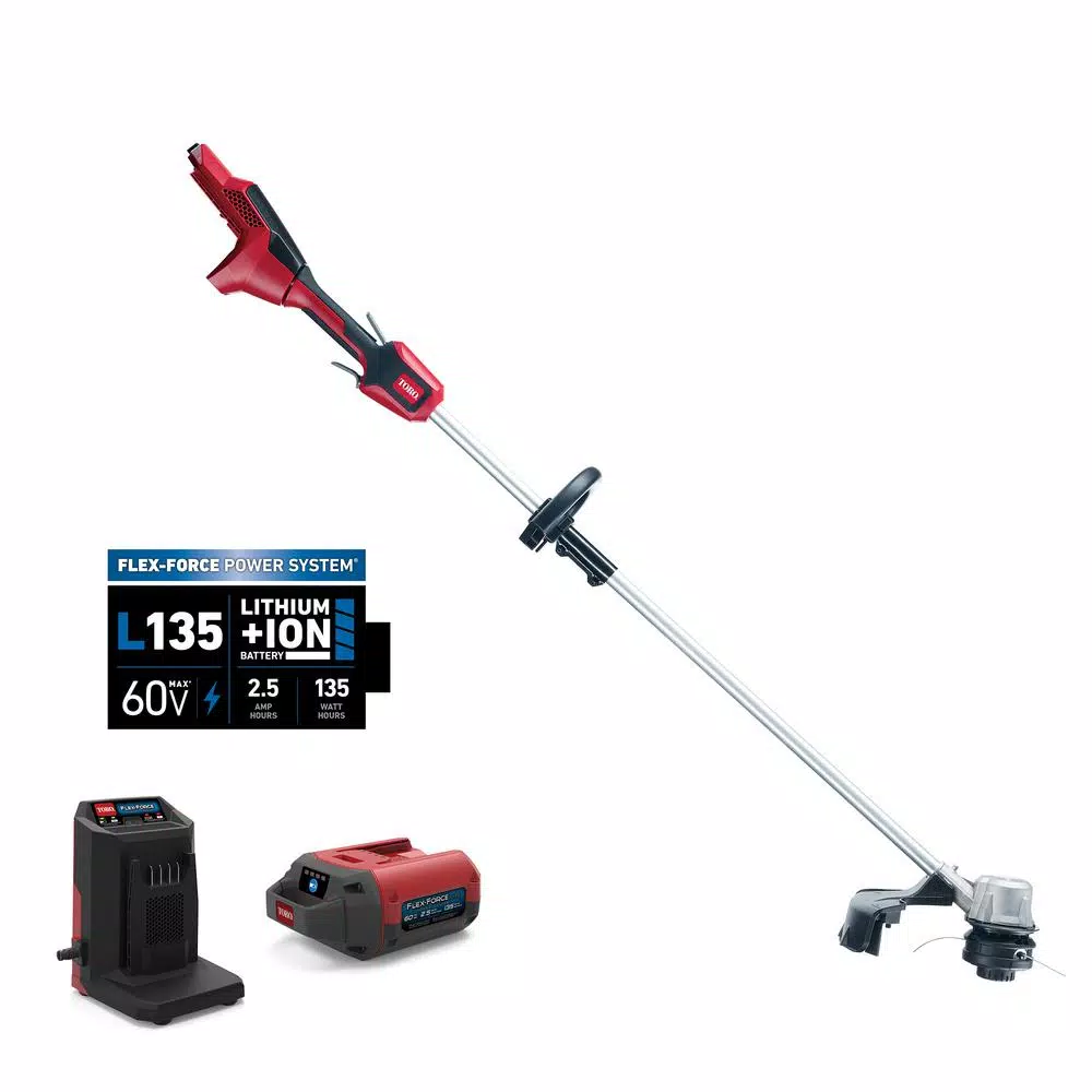Take charge of the overgrown grass with the Toro 14 in./16 in. 60-Volt Max Battery String Trimmer. This cordless, 60-Volts string trimmer allows you to pick your performance. Maximize run time or performance for the job by adjusting line size and/or cutting length. No spools required. Quick and easy line replacement. Just thread the line and spin the dial. Get more power and longer life out of your trimmer with the high-performance brushless DC motor that outperforms brushed motors. And, it is easy to match the speed to the job with the variable -speed trigger and two speed ranges to choose from. This trimmer is made for tough jobs. You can expect superior durability and performance with more motor torque and a cast aluminum direct-drive head. With 135 Watt-hours, the L135 battery provides up to a range of 30 to 50 minutes of run time based on the line settings. The innovative Flex-Force Power System features intelligent software that maximizes run time and performance. Have peace of mind, as Toro stands behind its products with a full warranty, not just limited coverage. Enjoy performance year round with more products in the Flex-Force battery line, from mowers to leaf blowers to snowblowers. The industry-leading expert in outdoor equipment solutions, now offers powerful hand-held products that rival gas-powered products. Choose Toro with confidence to save time, eliminate hassles and have a great-looking yard. Count on it.