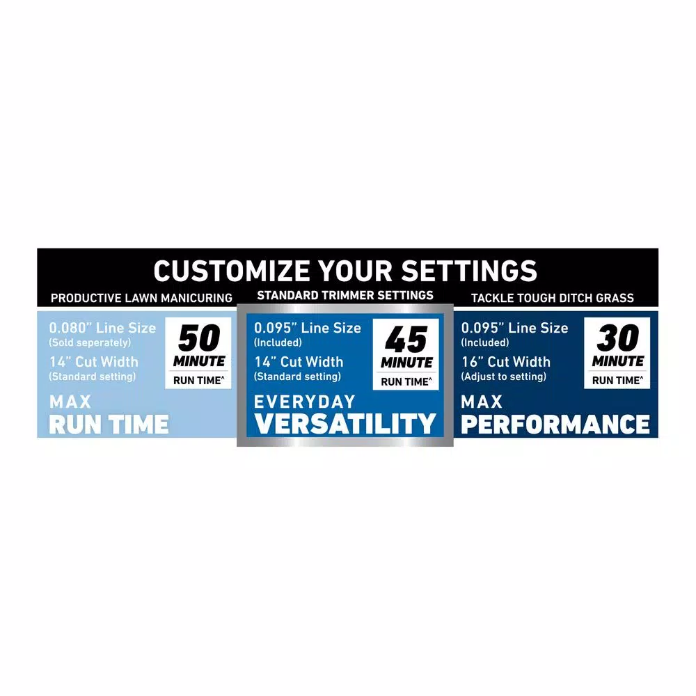 - Pick Your Performance for a quick clean-up or tackling tall, tough grass, customize performance to match the job by adjusting your line size and cutting length optimize for run time or performance by adjusting line size (.080 in. or .095 in.) and/or cutting length (14 in. – 16 in.) see chart for run times