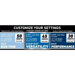 - Pick Your Performance for a quick clean-up or tackling tall, tough grass, customize performance to match the job by adjusting your line size and cutting length optimize for run time or performance by adjusting line size (.080 in. or .095 in.) and/or cutting length (14 in. – 16 in.) see chart for run times
