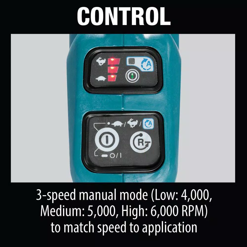 - Automatic speed change technology automatically adjusts cutting speed (4,000-6,000 RPM) and torque depending on density of application