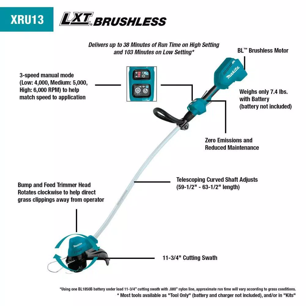 - Delivers up to 38-minutes of run time on high setting and 103-minutes on low setting under load using 18-Volt LXT 5.0Ah battery BL1850B (battery not included)