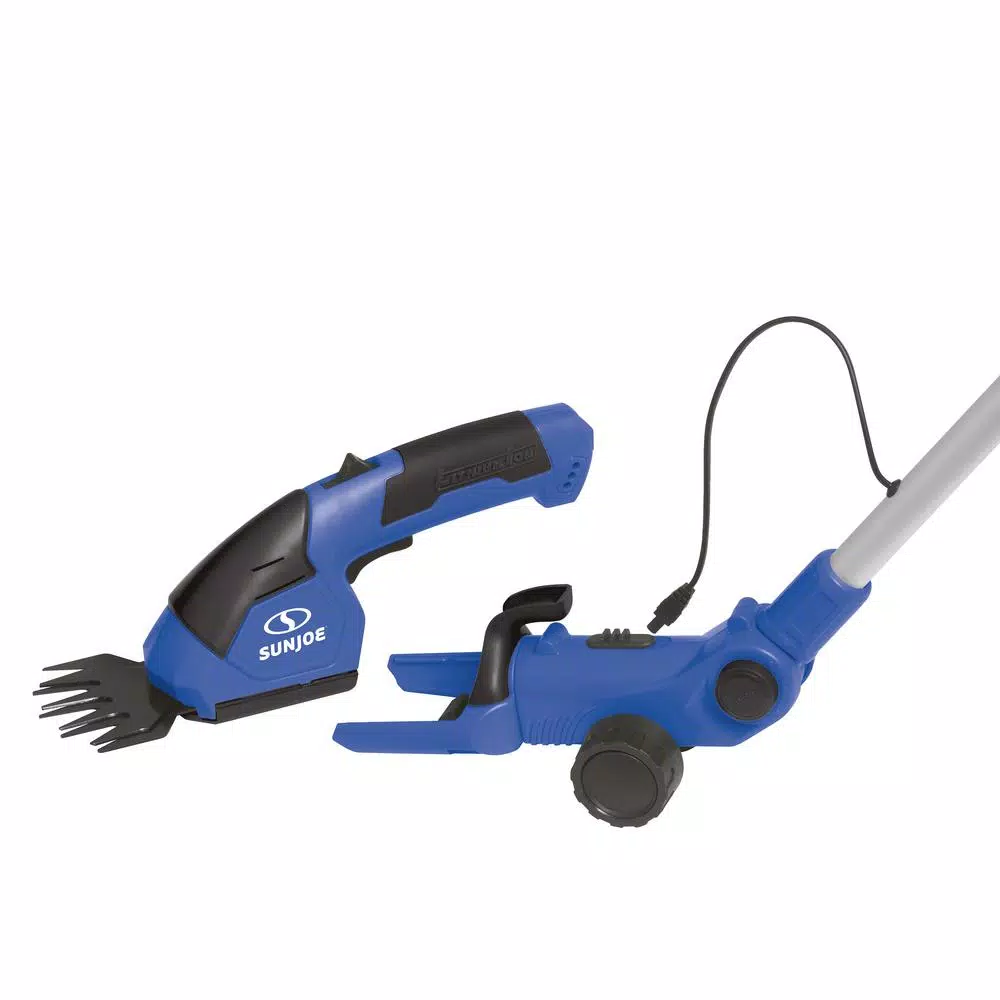 Perfect for post-mowing touch ups in tight spaces, the Sun Joe HJ605CC 2-in-1 grass shear and hedger with extension pole boasts a 7.2-volt long-life lithium-ion battery for hassle-free, cordless operation. Power up instantly with the push of a button and start shearing or scrubbing with cord-free convenience. Rechargeable battery power makes Sun Joe eco-friendly and maintenance-free, so you’ll be able to get the job done without having to worry about gas, oil, costly seasonal tune-ups or toxic hydrocarbon emissions. And because there’s a handy 3 ft. extension pole, its even better for your back. No more bending, crawling or straining in pursuit of the perfect edge. Sun Joe connects quickly, and detaches easily when you’re done. Combining 2 popular tools into 1 versatile device, Sun Joe features an interchangeable blade system that easily converts from a grass shear to a hedge trimmer. Both the 4 in. grass shear blade and the 6 in. hedge trimmer blade are constructed of durable steel for long-lasting wear and reliable performance. At only 3.5 lbs. Hedger Joe is easy to handle and control, so you can perform a variety of grooming tasks with more comfort and less strain. It also features a safety switch to prevent accidental starting. ETL approved and backed by a full two-year warranty, the Sun Joe HJ605CC 2-in-1 cordless grass shear and hedger with extension pole will quickly become your go-to yard and garden-grooming tool of choice.